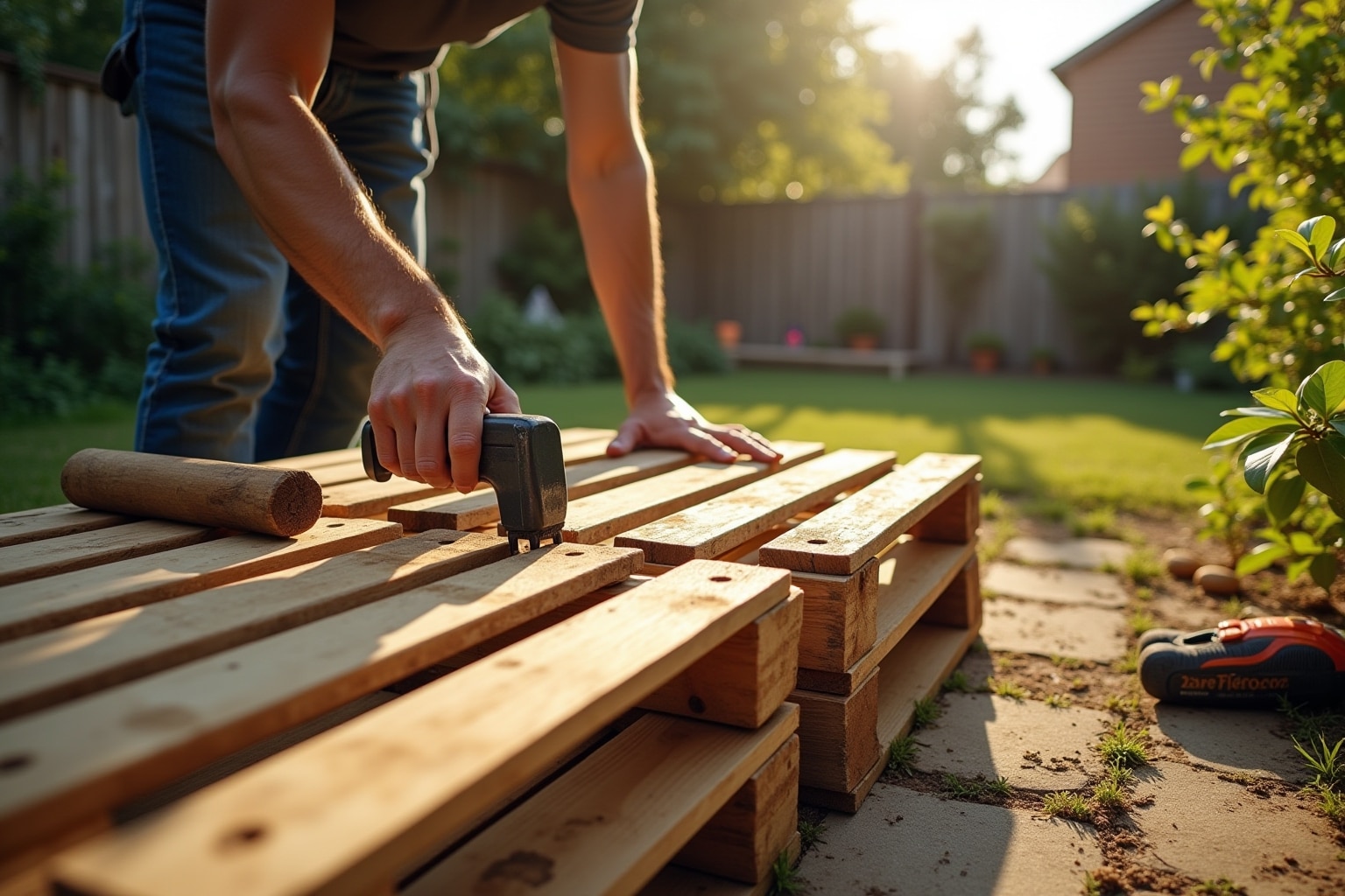 - Aufbau: Staple und verschraube die Paletten zu den gewünschten Elementen (z.B. Sitzflächen mit integrierter Rückenlehne).