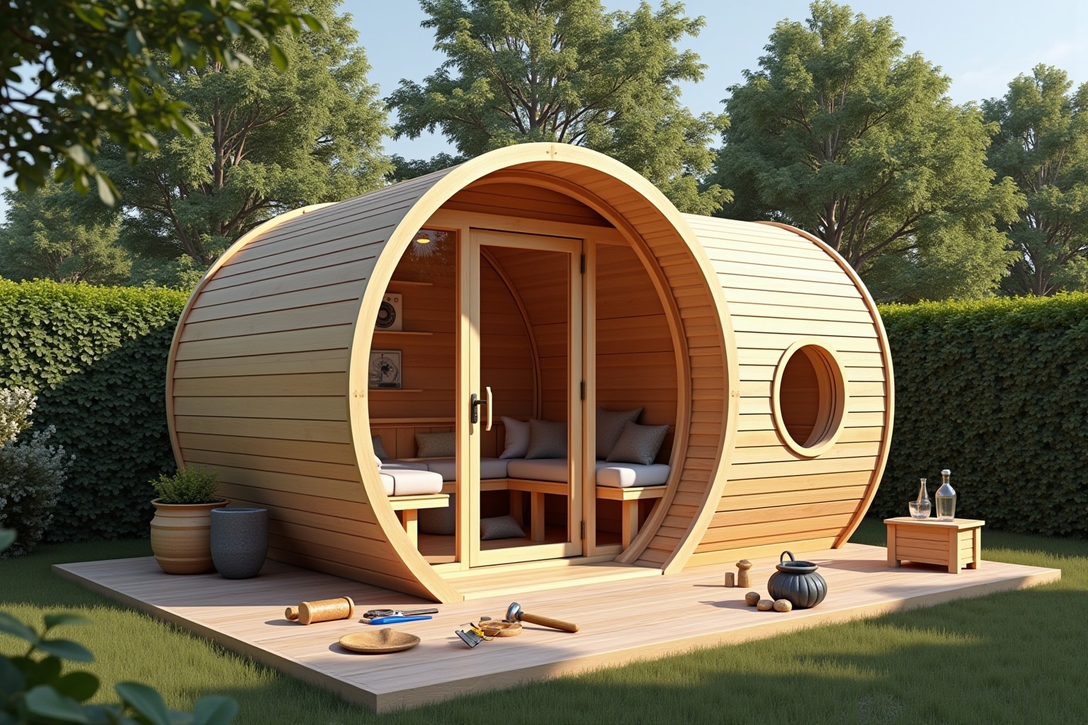 Überlege, wie viele Personen die Sauna regelmäßig nutzen sollen. Dies bestimmt die Grundfläche und die innere Aufteilung. Ein typisches Maß für eine 2-4 Personen-Sauna liegt bei etwa 2 x 2 Metern. Denke auch an die Raumhöhe – sie sollte ausreichend sein, um bequem auf den Saunabänken sitzen zu können, aber nicht so hoch, dass die Wärme unnötig entweicht. Das Design sollte sich harmonisch in deinen Garten einfügen. Wähle Materialien, die wetterbeständig sind und optisch ansprechend wirken.