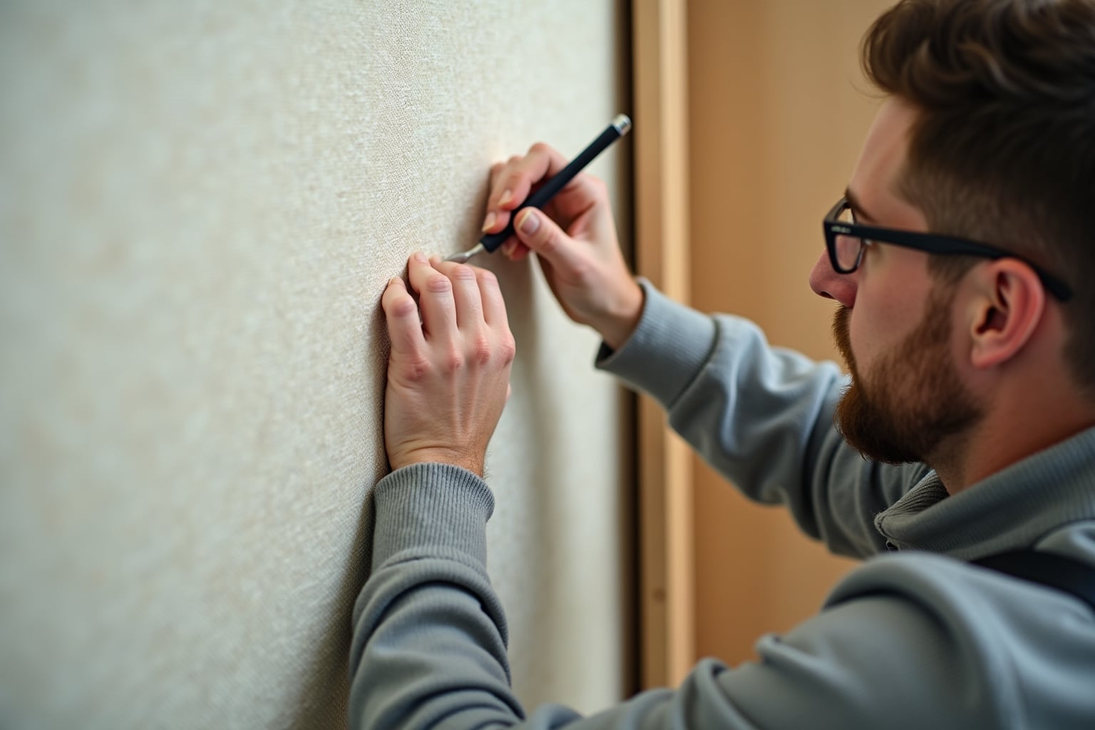 - Tapete zuschneiden: Schneide ein Stück Raufasertapete zu, das etwas größer ist als die reparierte Stelle. Achte darauf, dass die Struktur und Körnung der Tapete zur umgebenden Tapete passen.