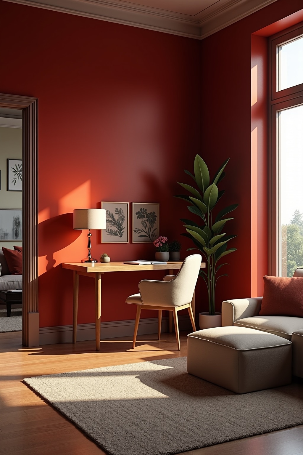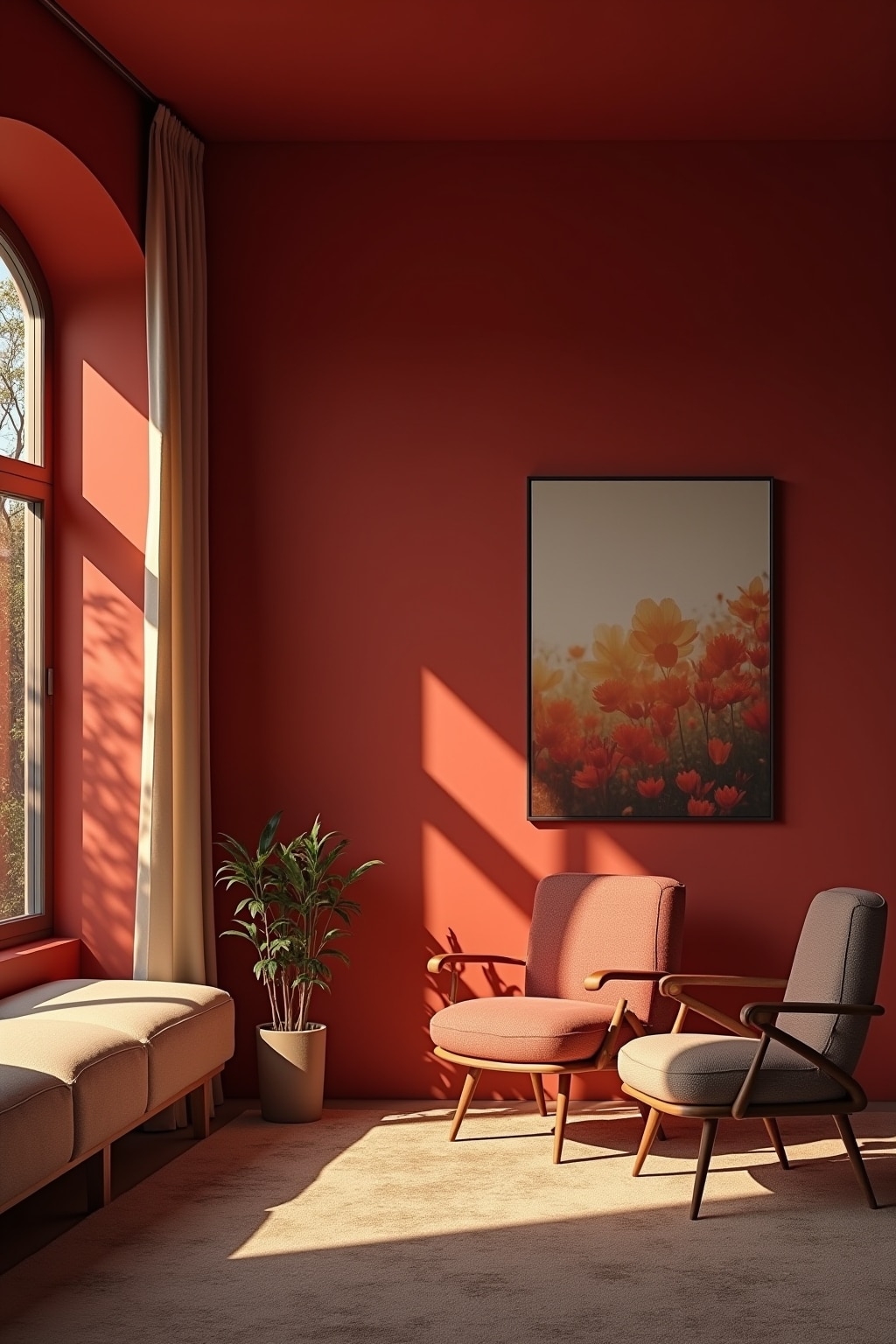 Kombinierbarkeit: Rote Wände harmonieren hervorragend mit Naturholz, neutralen Beige- und Grautönen sowie metallischen Akzenten in Gold oder Messing.